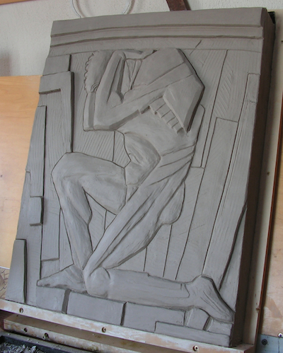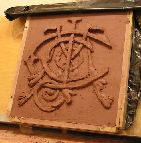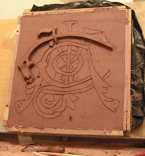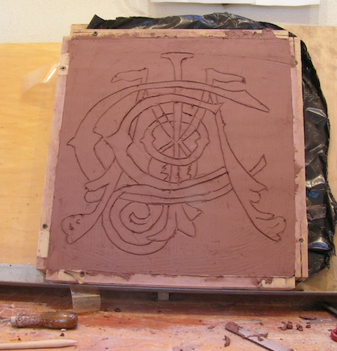 Setting up the model with the lettering outlines inscribed on the clay for reference: