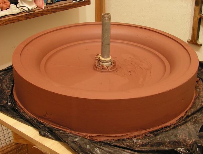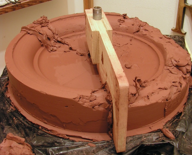 Hand-pressed clay involves real work, physically taking the moist clay and both pressing and ramming small amounts of it into the plaster mold, pressing and working it in to remove air and squeeze the clay into all of the fine details. As the sculpture is built up to the top surface of the mold it is then levelled off on the back and hollowed out by hand, leaving the clay about 1/2 inch to one inch thick.