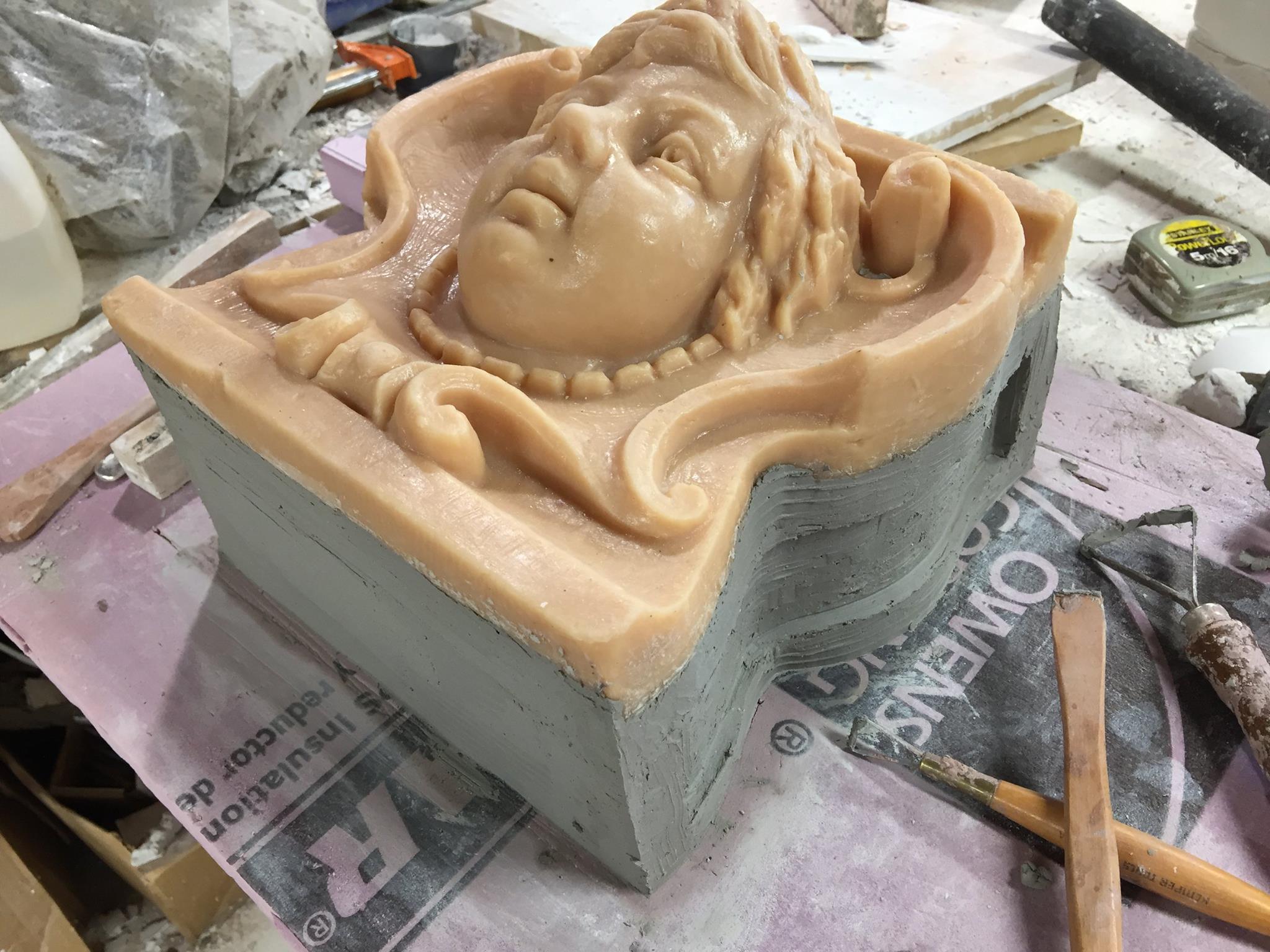 The new rubber positive has been laid on 4″ thick foam board and the clay built up aound the perimeter. I have it roughed out for now, to-morrow I’ll finish texturing and cleaning up the clay part and I can start pouring the 4 side sections to start with then. There’s virtually no undercuts on the design at all, so the face/front can be done in one large plaster mold section, 5 sections total.