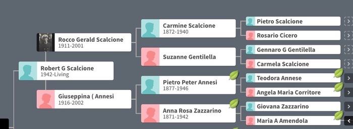 This includes others not  shown on this tree; Bobby Scalcione (California) Anthony Scalcione,  the Pietro Peter Annesi family,  Leslie Miller, Gentilella, Zazzarino, Denley, and the James Hicks/ Joanne Scalcione Hicks family, and Matt Armiento.