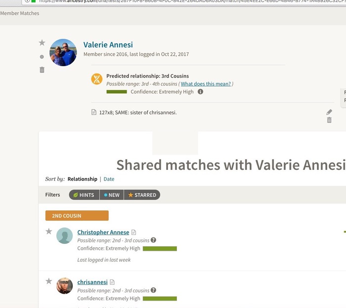 And this proves my ancestry connection to the Annesi side of my father’s line-  decendants of Pietro Annesi in my tree showing as 3rd cousin Valeri and Chris Annesi 2nd or 3rd cousin.  Pietro is my father’s maternal grandfather.