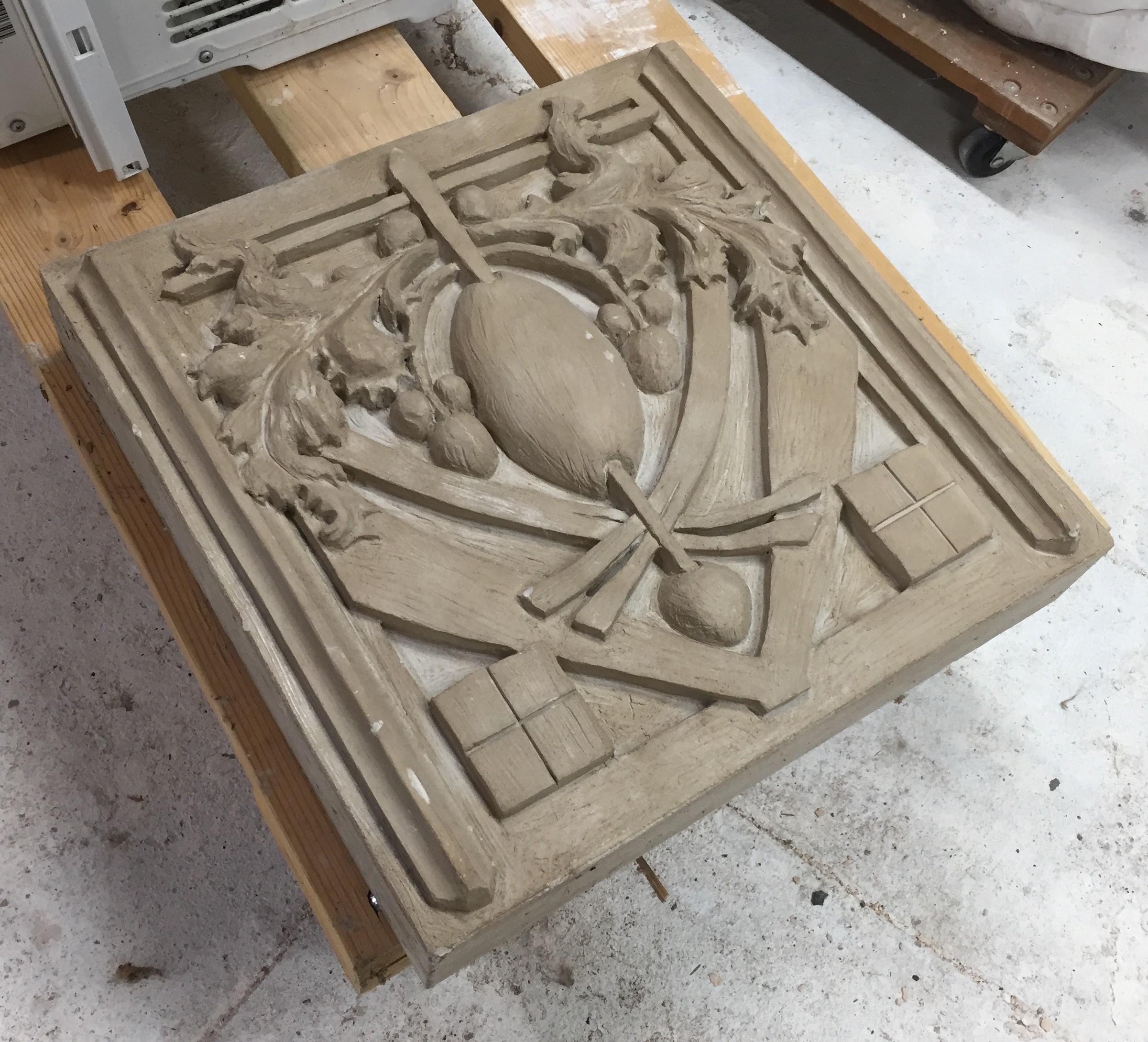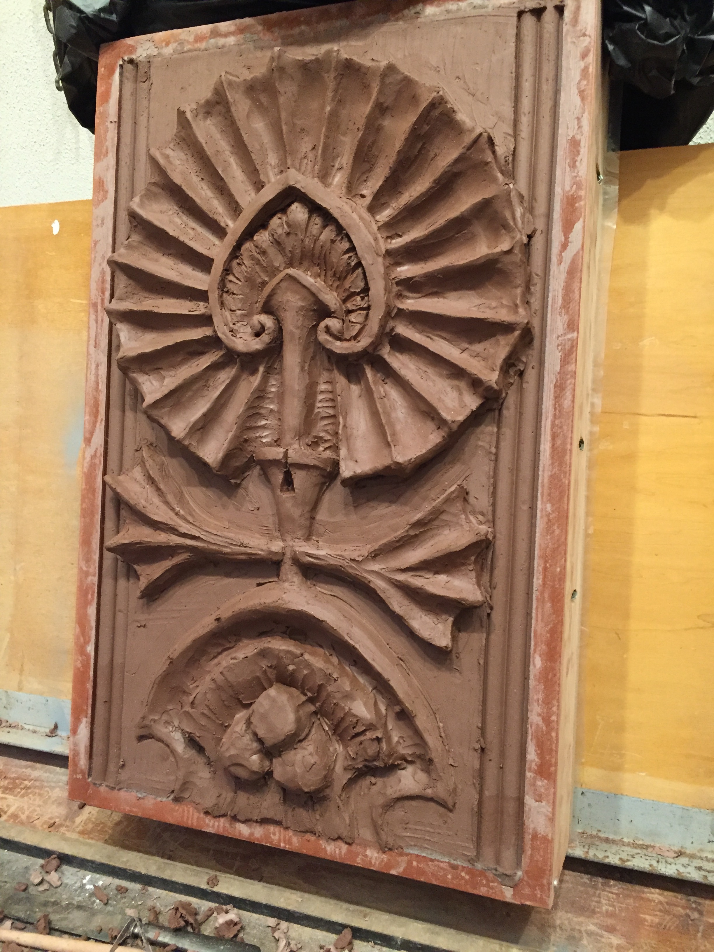 I had to dig out some old unfired very fragile clay models of mine from the corner in the utility room since I had to replace the sump pump hose. This model of a Louis Sullivan design I did in 2008, I’m likely going to convert it to do it in terracotta, so I left the unfired clay model out to look over and plan for that.