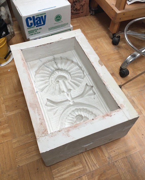 When these are pressed from terracotta, due to clay shrinkage, the fired terracotta version will be slightly smaller- approx 10-15%, so those will wind up around 19″ high and 11-1/2″ wide which will be a nice residential scaled sculpture that can be displayed indoors or outdoors, it can be embedded into a brick, concrete or stone wall.