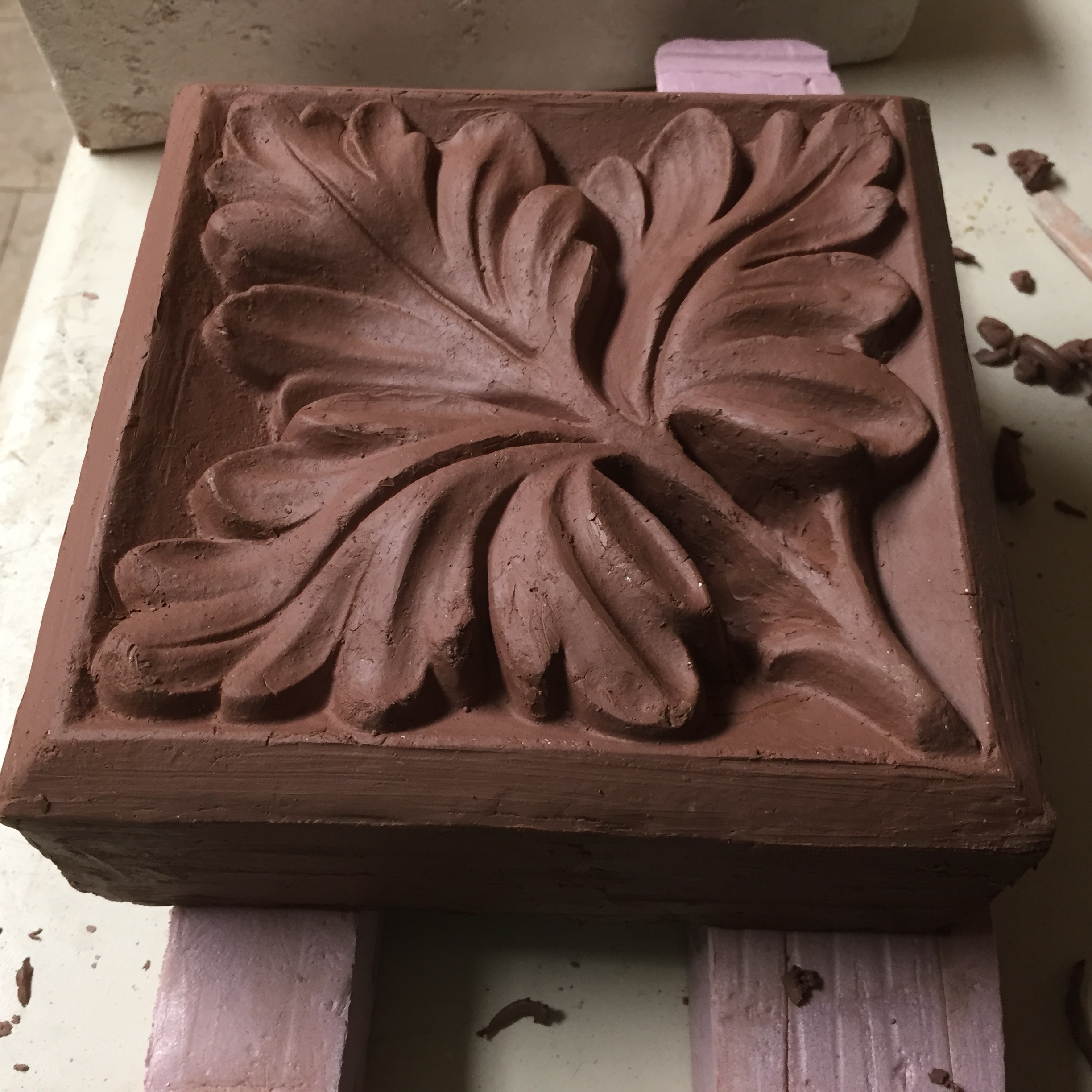 Now I have the first hand-pressed red terracotta architectural leaf blocks done and ready to start drying, this will shrink somewhat and I have not priced these yet, but pretty soon I will know the exact size it will wind up, and a price determined.