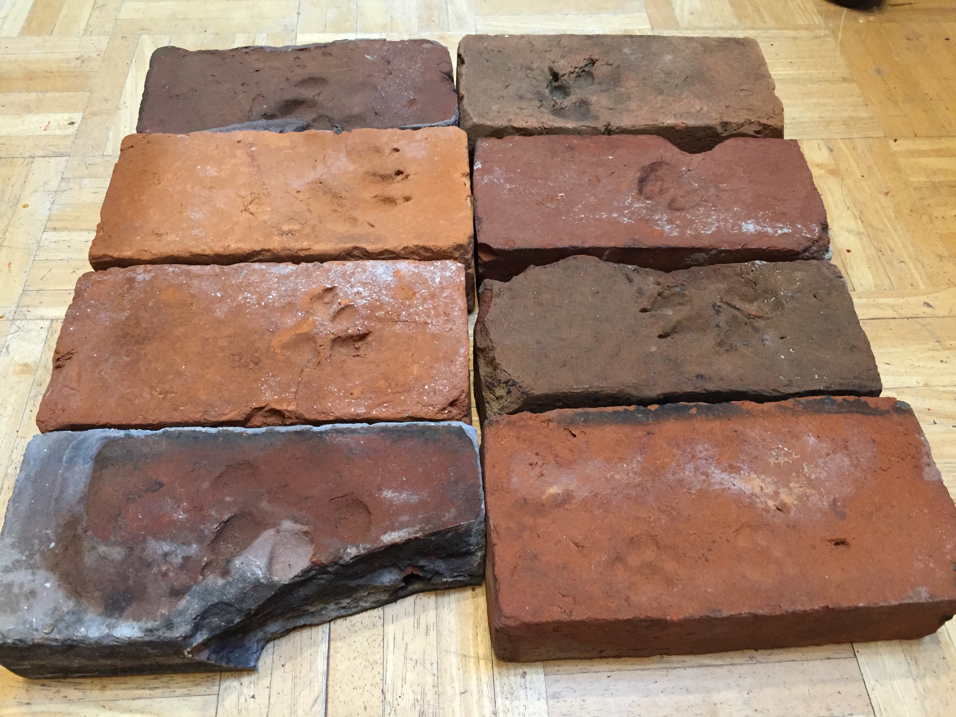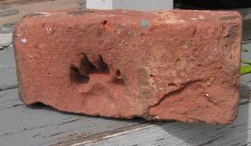 One brick has a fawn deer hoof print and one has what appears to be a kitten’s prints, all were pressed into the moist clay before the clay dried and firmed up.