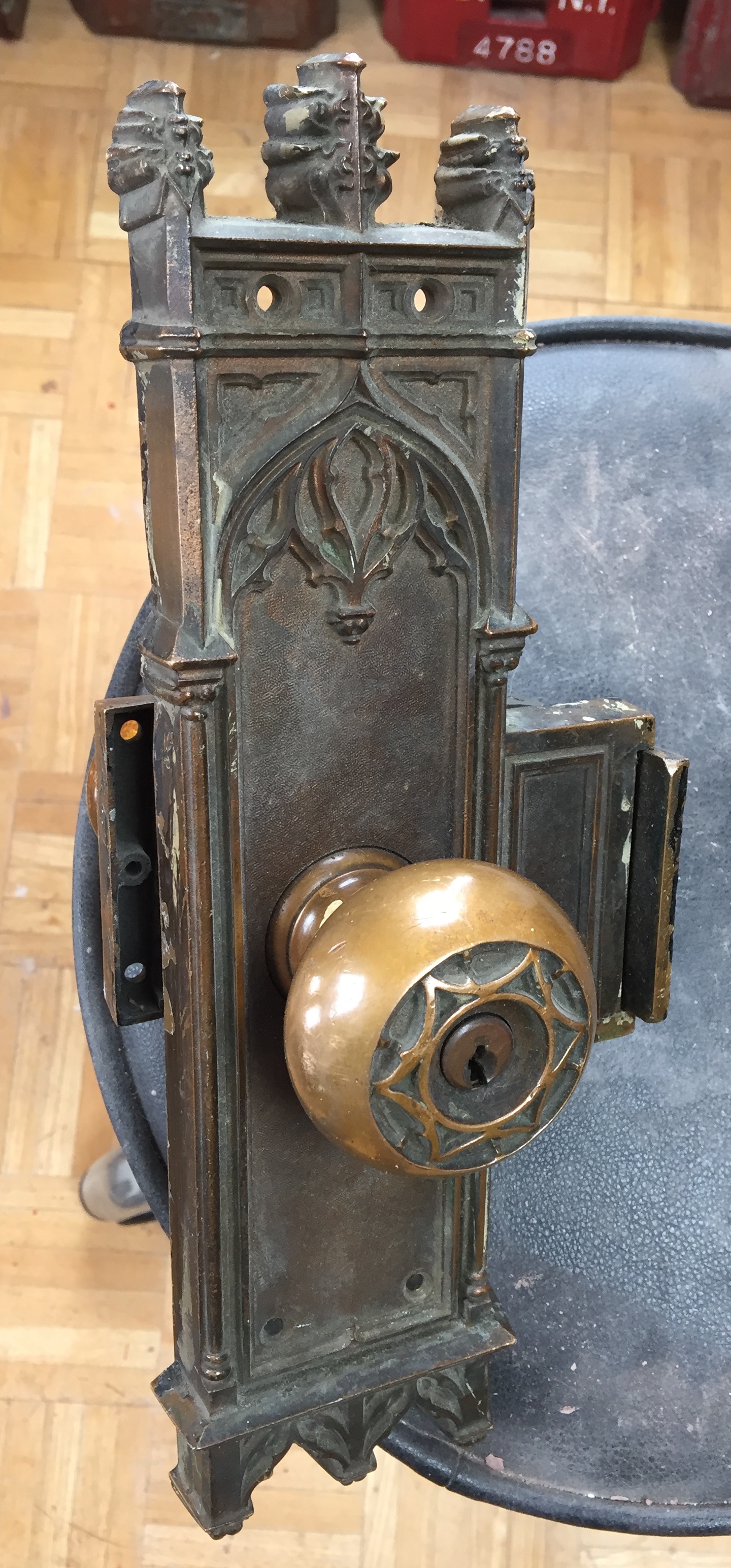 Artifact: Two brass gothic door lock assemblies